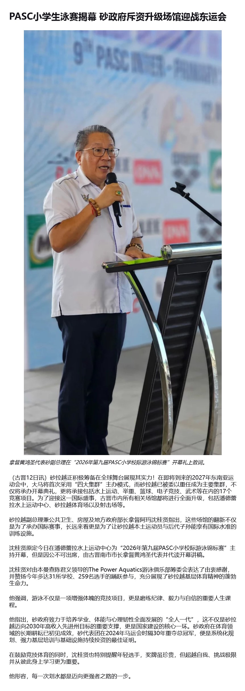 PASC小学生泳赛揭幕 砂政府斥资升级场馆迎战东运会