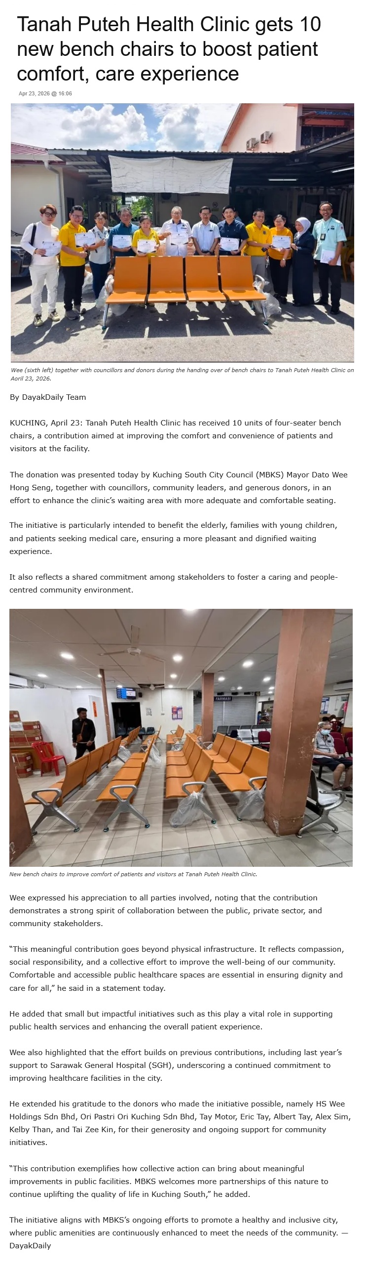 Source of News: https://dayakdaily.com/tanah-puteh-health-clinic-gets-10-new-bench-chairs-to-boost-patient-comfort-care-experience/