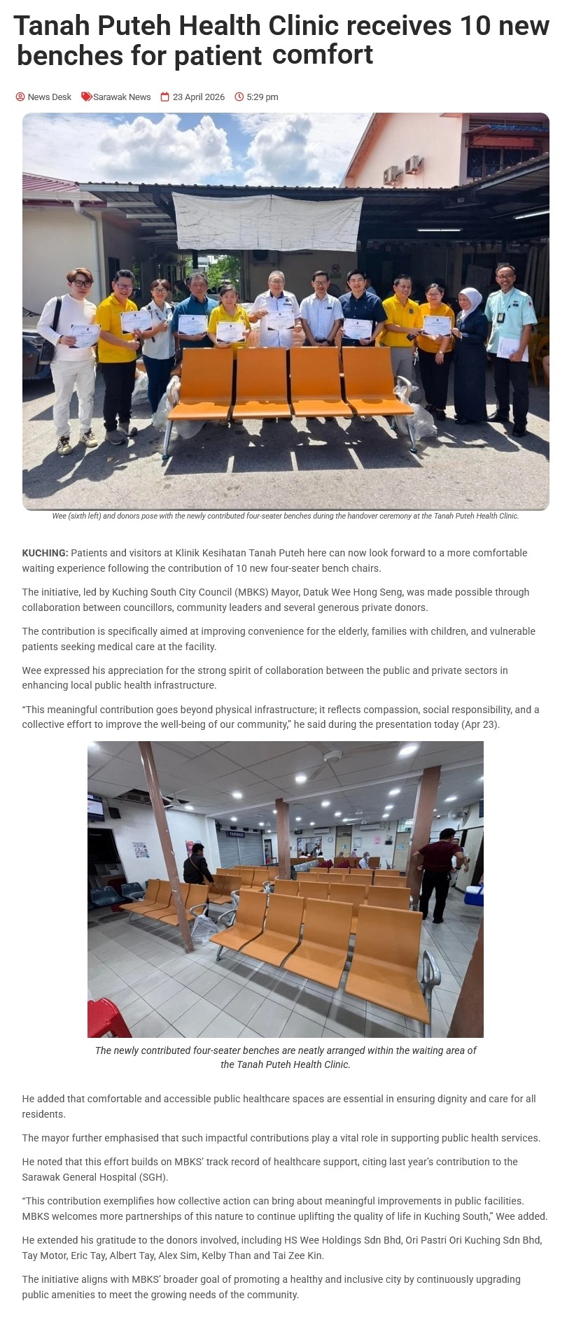 Source of News: https://www.sarawaktribune.com/tanah-puteh-health-clinic-receives-10-new-benches-for-patient-comfort/